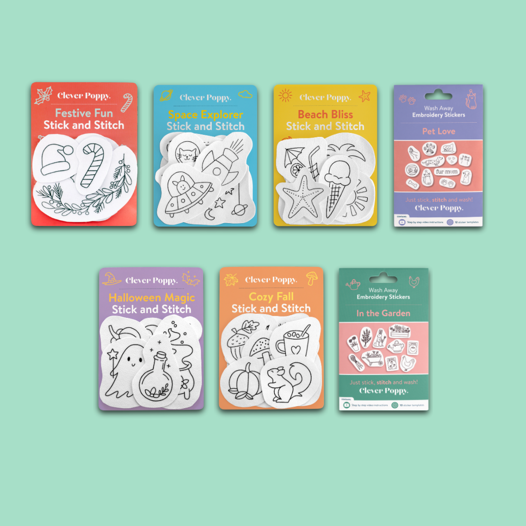 The bundle includes all six of our stick and stitch packs and will look great embroidered onto your clothing and accessories (t-shirts, denim shorts, tea towels, pencil cases, pillows, and so much more!).