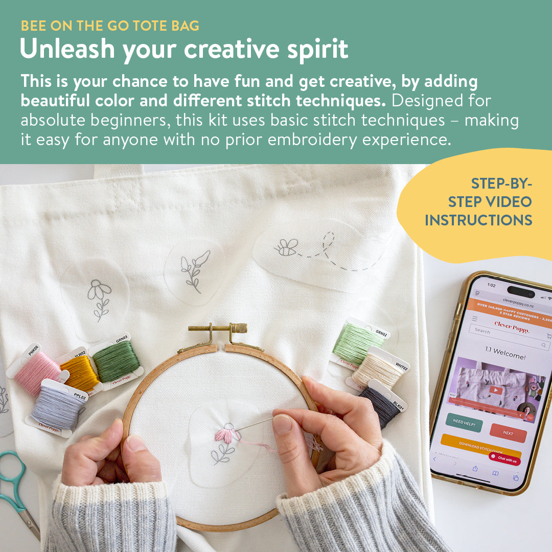 Introducing the Bee on the Go Tote Bag Kit, a beginner-friendly project from our Honey Blooms functional embroidery collection. This kit shows you how to transform a premium 100% cotton tote bag into a stunning personalised accessory using our easy peel-and-stick, wash-away embroidery stickers. No tracing, no prep, just pure creative fun.