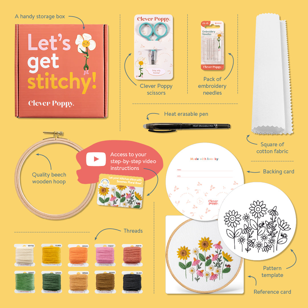 Whether you're relaxing with a new hobby or stitching up a thoughtful gift, Summer Floral Row brings a little joy and creativity to your hoop.