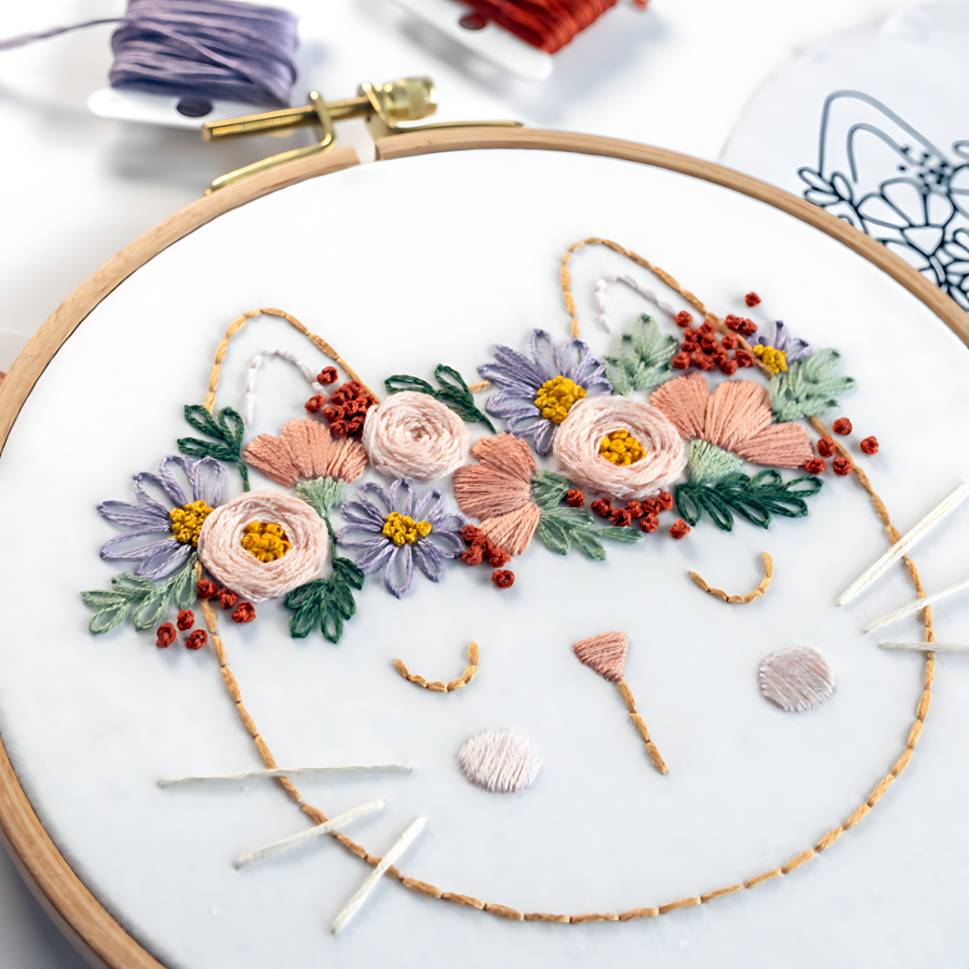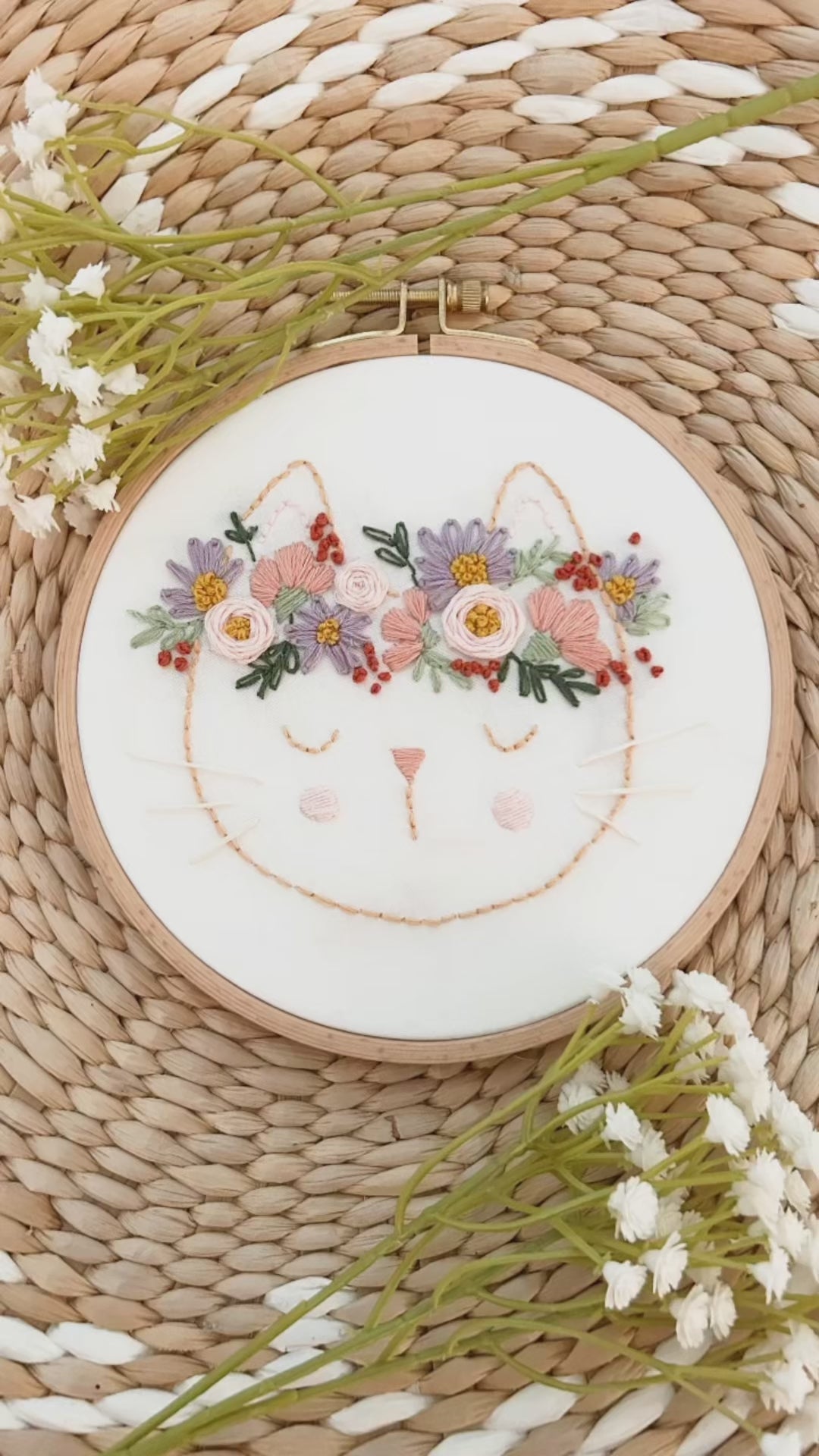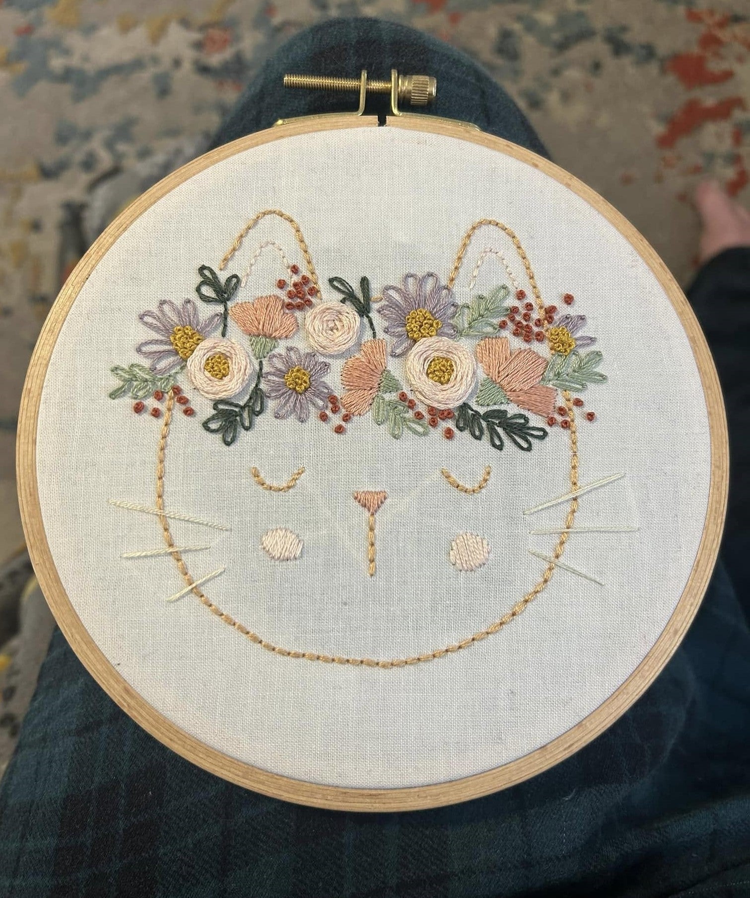 The Flora the Cat finished hoop measures 6” in diameter (16cm).