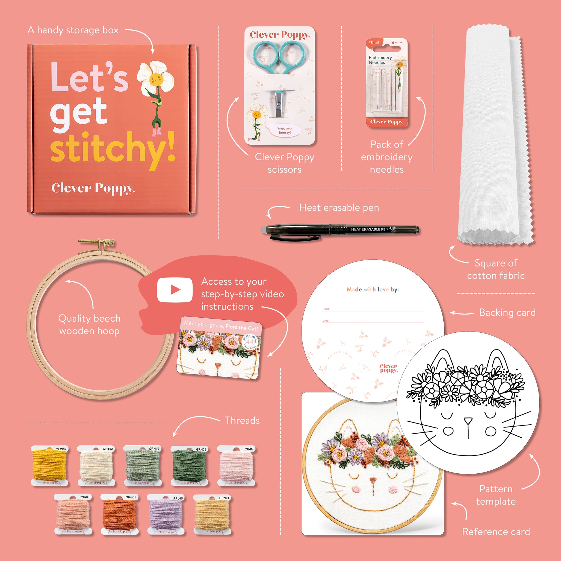 1x Quick start card With access to the Flora the Cat video experience, so you can start stitching along with us!